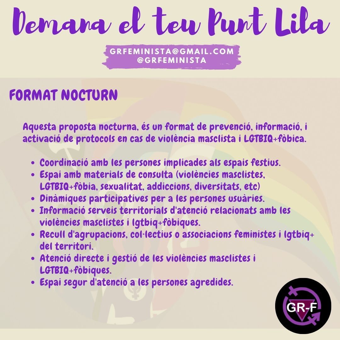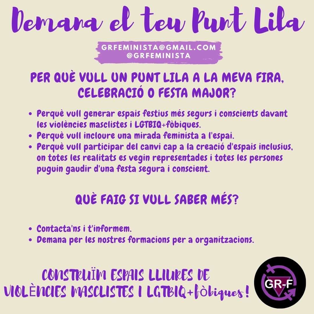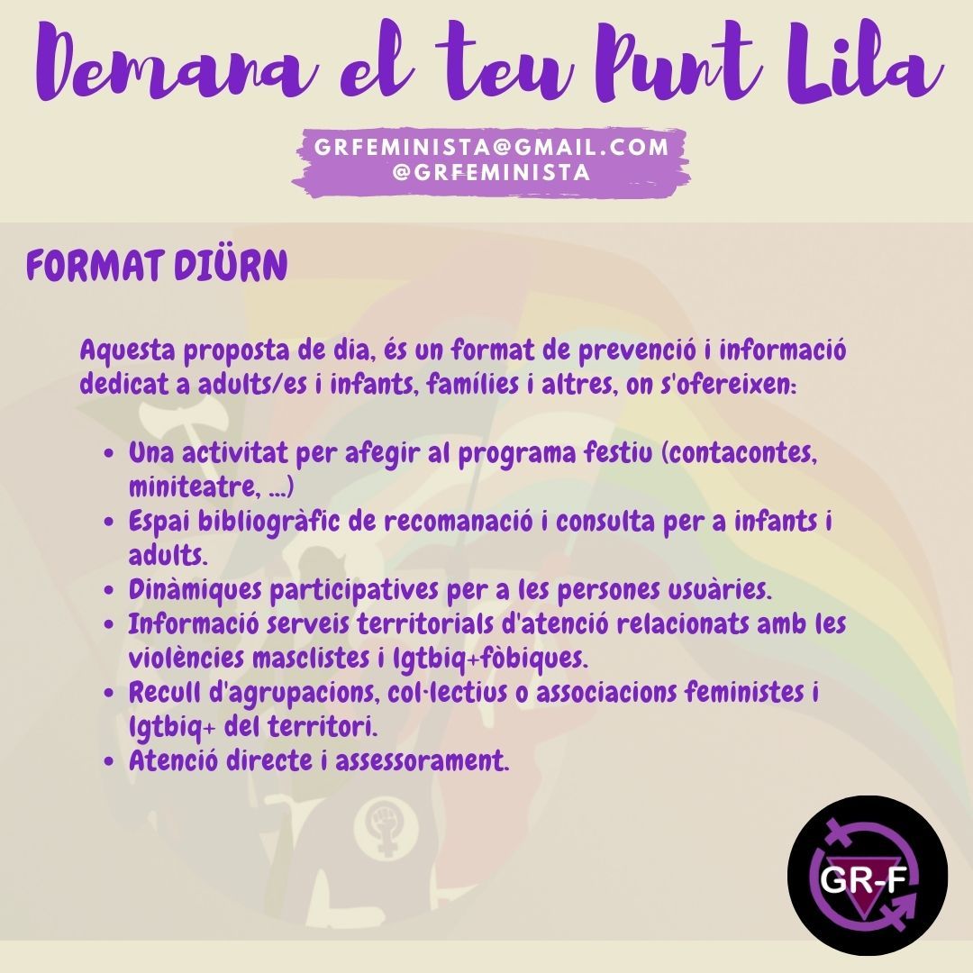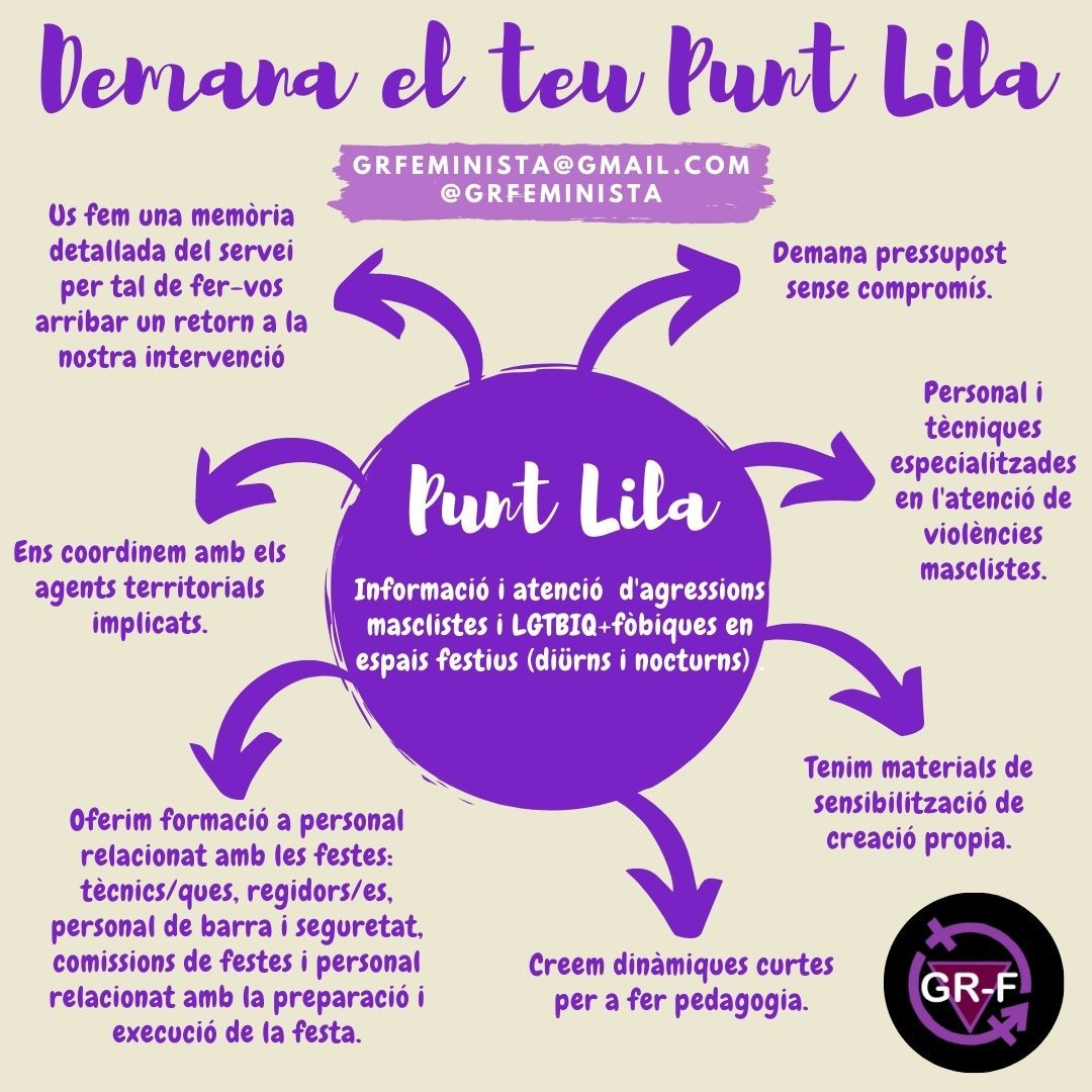 Els PUNT LILA són un servei dirigit a tota la població de prevenció, sensibilització i atenció a les violències masclistes i LGTBIQ+fòbiques, que tenen una arrel estructural relacionada amb la intersecció de privilegis i opressions, principalment les que venen motivades per raó de gènere, sexe, racialització, capacitats, etc.
